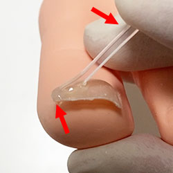 巻き爪に特化した専門の国際・国内の特許取得済み日本生まれの補正技術です。補正器具は、選び抜かれた特殊樹脂を使い、今までにない湾曲面をもった補正具を使用するため、巻いた爪を持ち上げやすくなりました。もちろんゆっくり優しく持ち上げるため、心地よい施術を受けていただけます。
